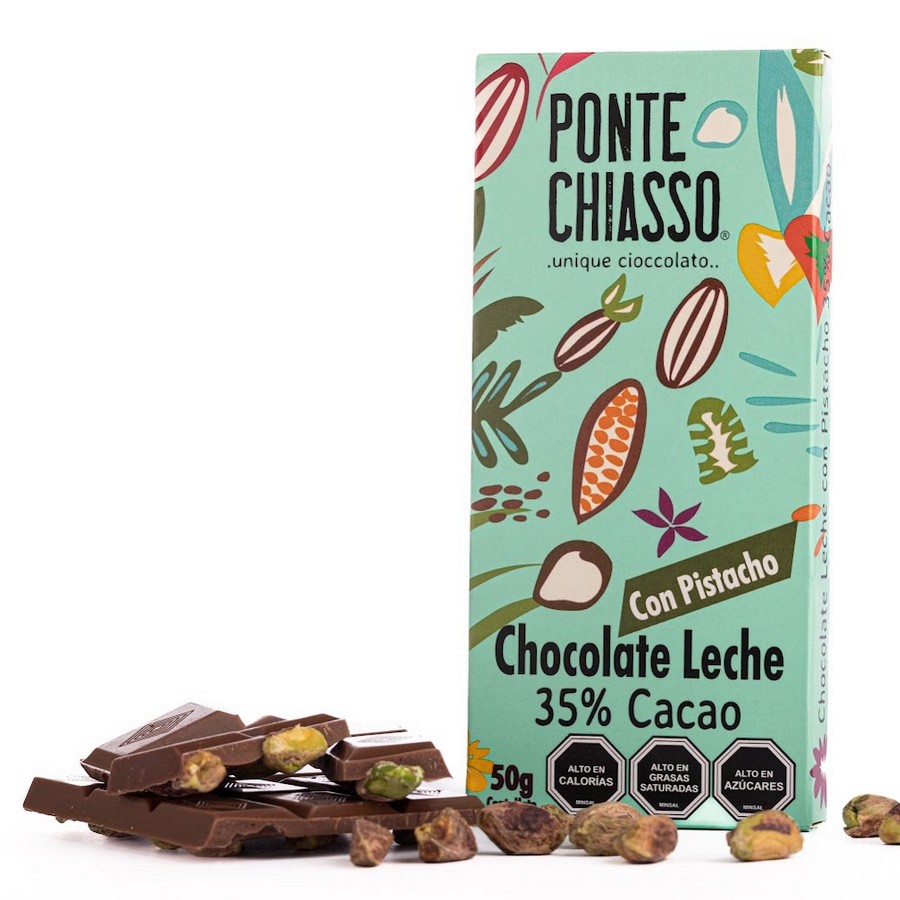Barra de chocolate leche 35% con pistacho.