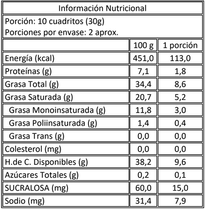 Ingredientes: Pasta de cacao, maltitol, polidextrosa, emulsionantes (lecitina de soya y polirricinoleato de poliglicerol), saborizante idéntico a natural, SUCRALOSA.