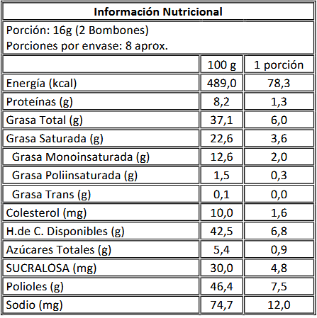 Ingredientes: Pasta de cacao, maltitol, leche entera y descremada en polvo, polidextrosa, emulsionantes (lecitina de soya y polirricinoleato de poliglicerol), saborizante idéntico a natural, SUCRALOSA.