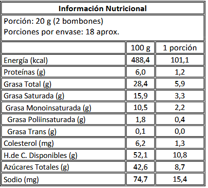 Relleno: Azúcar, manteca de cacao, pasta de cacao, leche entera y descremada en polvo,suero en polvo, manteca de palma y palmiste, cacao en polvo, almendras tostadas, glucosa,leche condensada, crema vegetal, pasta de avellanas europeas, sorbitol, pulpas de fruta(naranja, mango, frambuesa, maracuyá y lucuma), mantequilla, ron, maltodextrina, pastade pistacho, manjar, emulsionantes (lecitina de soya, polirricinoleato de poliglicerol), ácidocítrico, café, saborizantes idénticos a natural y saborizantes artificiales, sorbato de potasio.